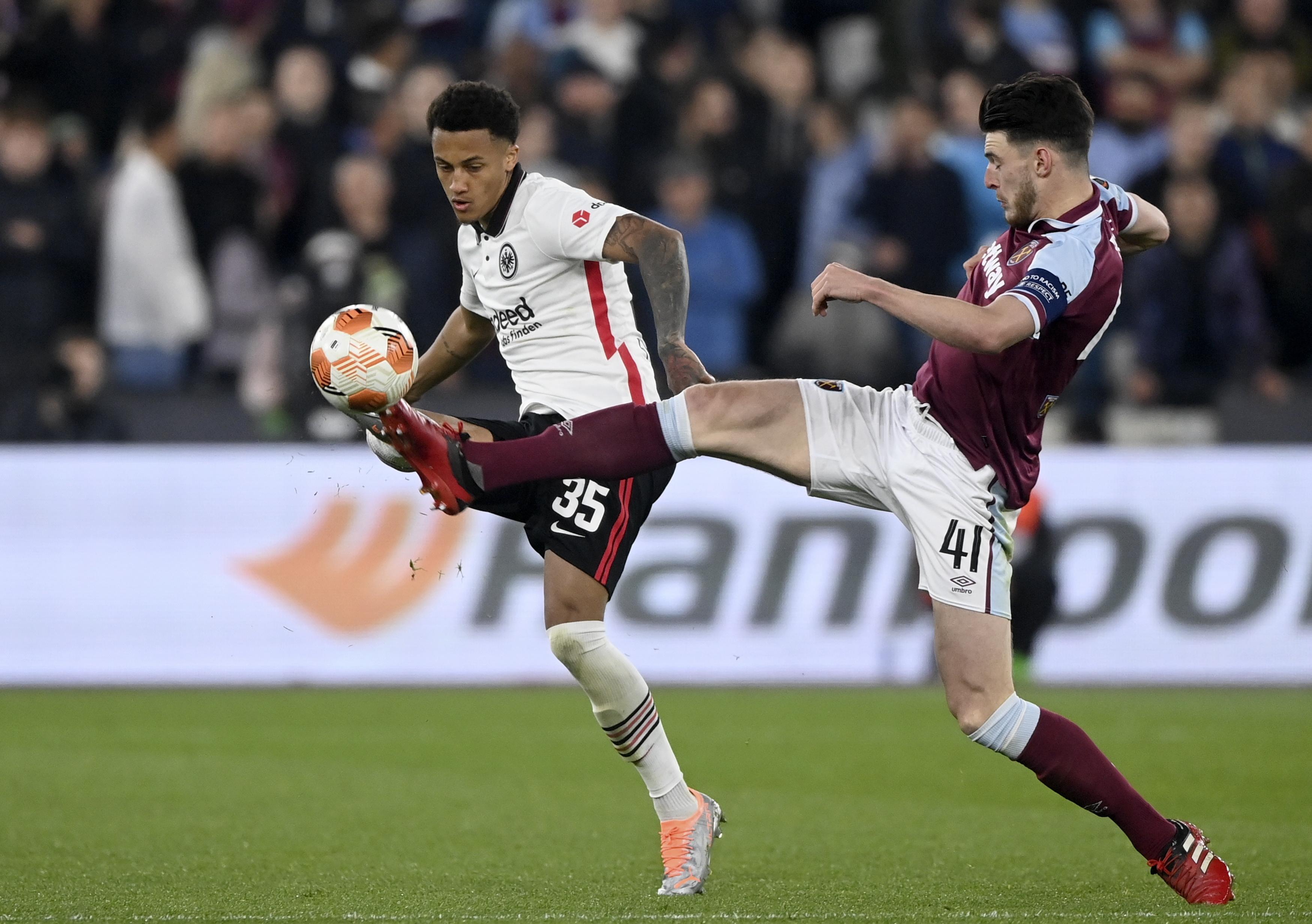 4月28日,法兰克福队球员赖斯(右)与西汉姆联队球员图塔拼抢。 新华社/欧新