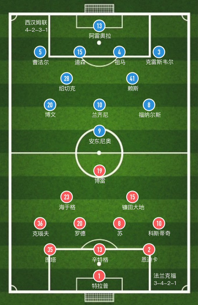 西汉姆联(4-2-3-1): 13-阿雷奥拉,5-曹法尔(87' 7-亚尔莫连科),15-道森,4-祖马,3-克雷斯韦尔,28-绍切克,41-赖斯,20-博文,10-兰齐尼(22' 31-约翰逊),8-福纳尔斯(74' 9-本拉赫玛),9-安东尼奥