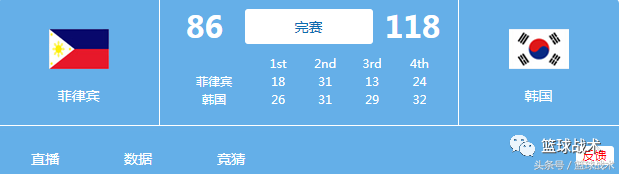 同样韩国队是小组第三,下克上灭了中国队的苦主菲律宾,韩国队进4强了。