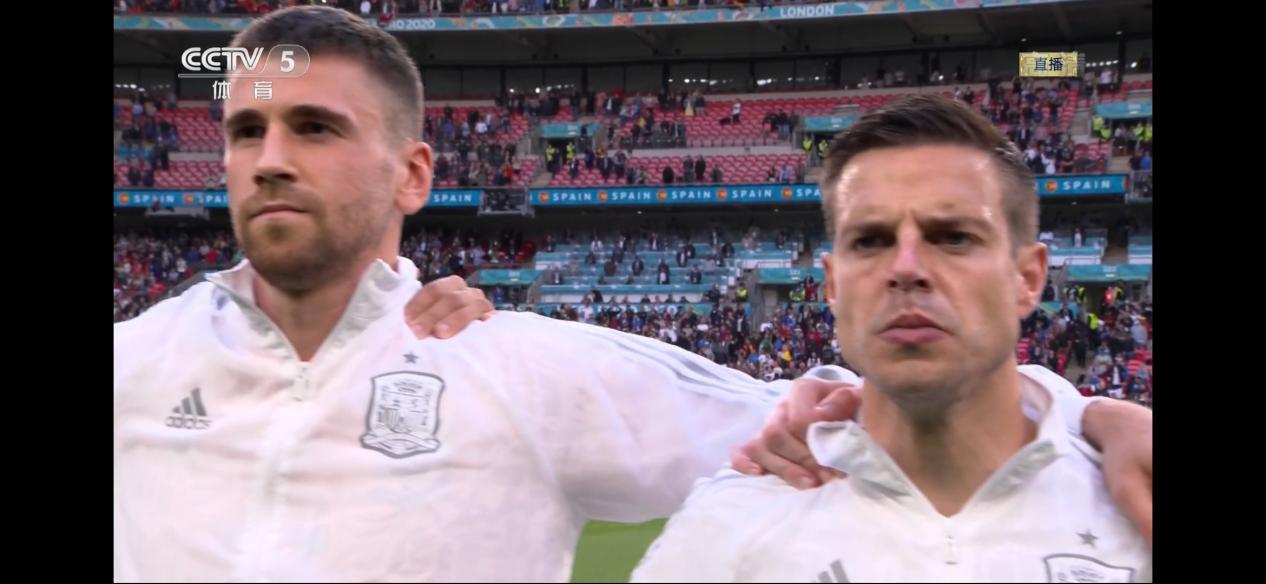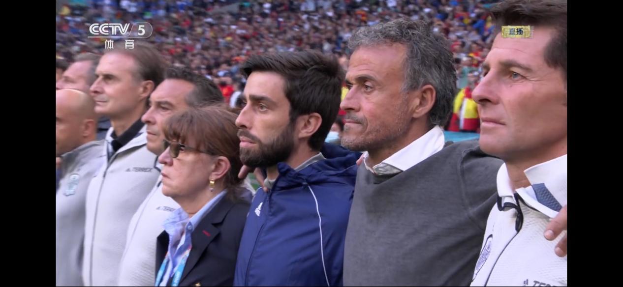 赛前奏国歌仪式,西班牙国歌率先奏响。转播镜头显示,西班牙队球员肩并肩站成一排后,并没有跟唱,而是静静聆听。