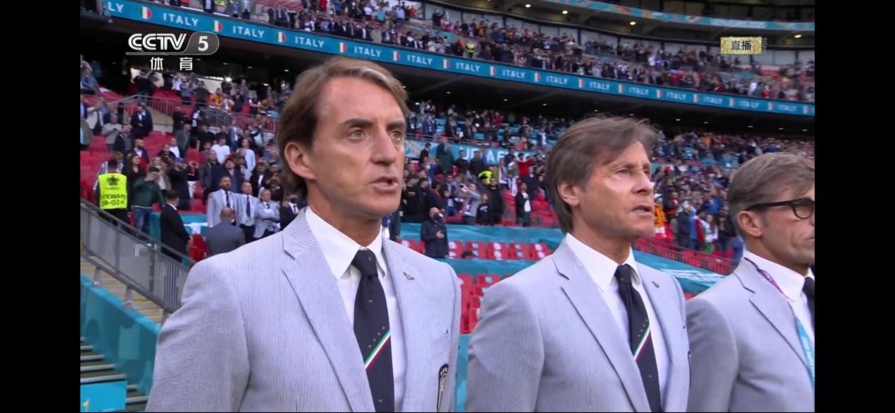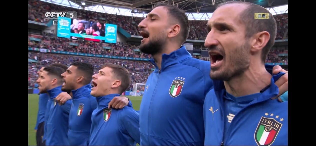 与此形成鲜明对比的场景随后到来。西班牙国歌奏毕后,意大利国歌在全场响起,意大利队球员们同样肩并肩站在一起。但不同的是,镜头显示,他们慷慨昂扬地引吭高歌,用“嘶吼”来形容似乎也并不过分。