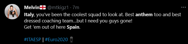 “意大利,你们看起来已经是最酷的阵容了。还有最棒的国歌(表现方式)和最会打扮的教练组... 但是我需要你们这些家伙告别(本届欧洲杯)!”