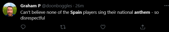 “不敢相信西班牙球员没有一个人跟唱他们的国歌,太不尊重了”