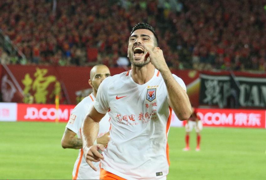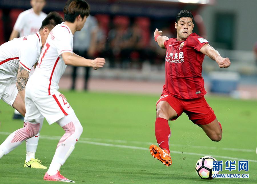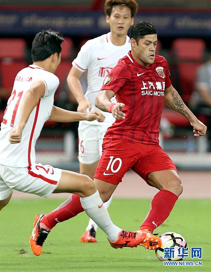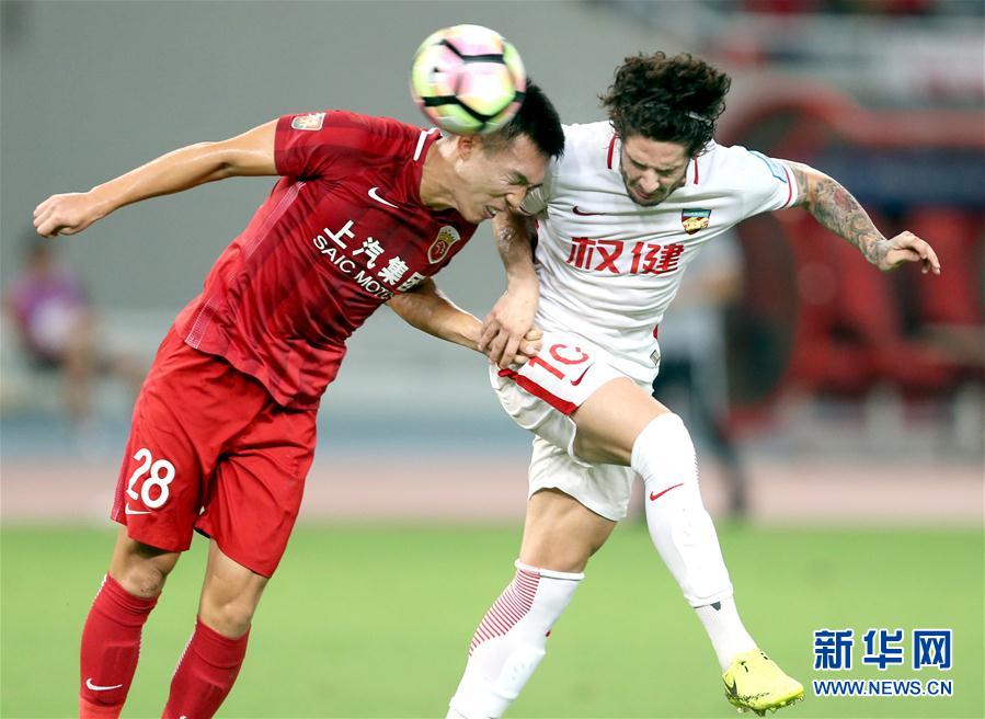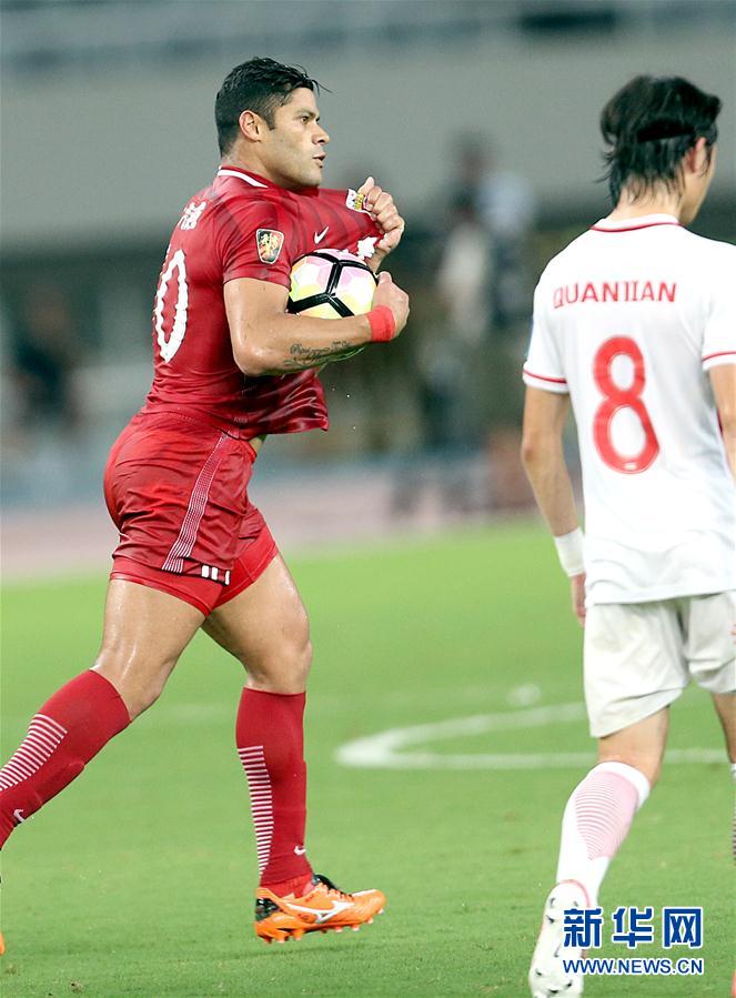 8月3日,上海上港队球员胡尔克(右)在比赛中攻入第一粒进球。新华社记者凡军摄