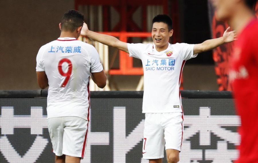 8月3日,上海上港队球员胡尔克(左)进球后庆祝。新华社记者凡军摄