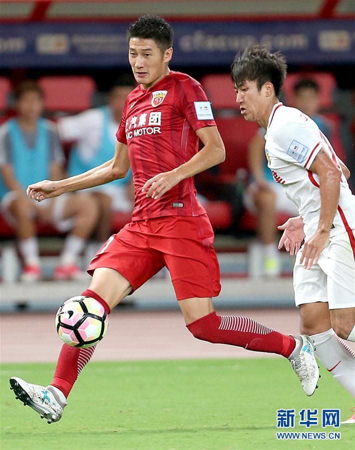 8月3日,上海上港队球员于海(左)在比赛中带球突破。 新华社记者凡军摄