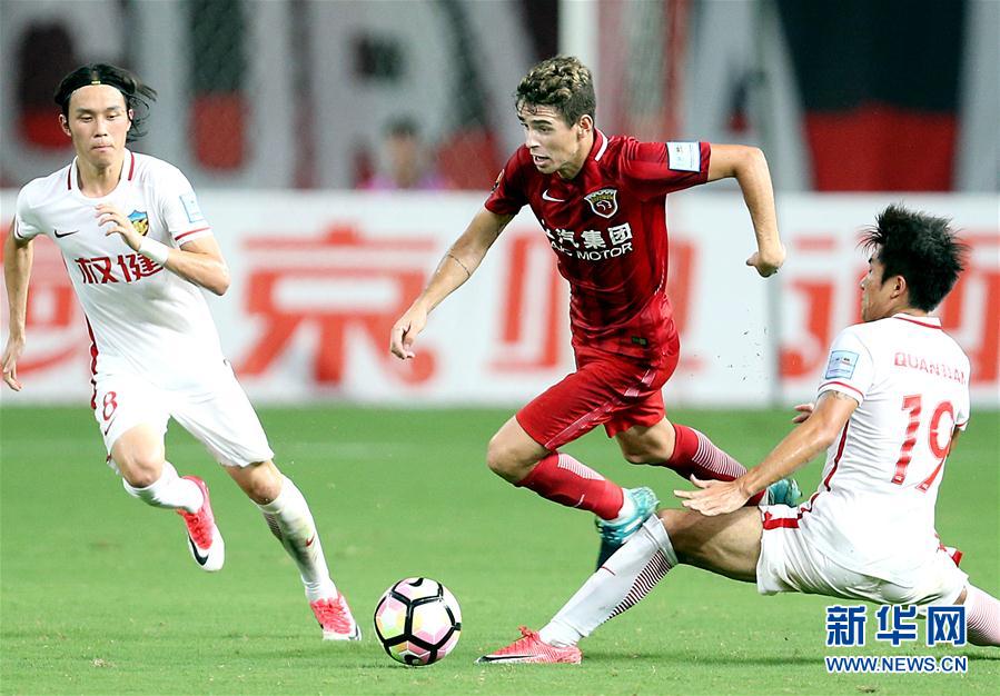 8月3日,上海上港队球员奥斯卡(中)在比赛中带球突破。新华社记者凡军摄
