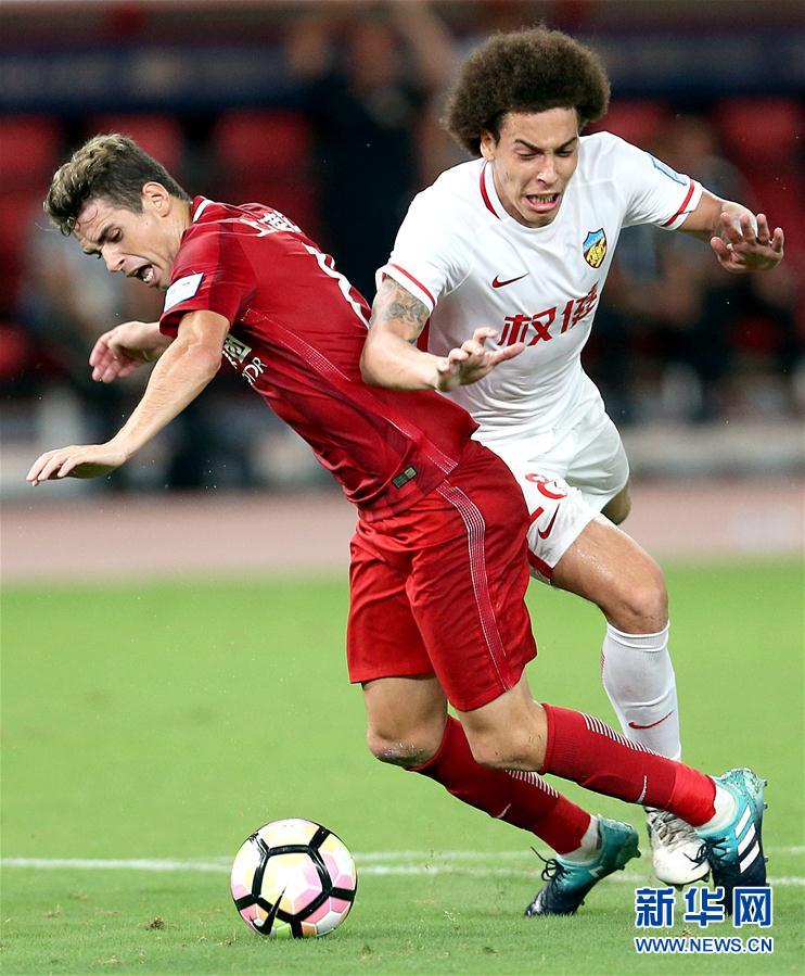 8月3日,上海上港队球员奥斯卡(左)与天津权健队球员维特塞尔在比赛中拼抢。新华社记者凡军摄