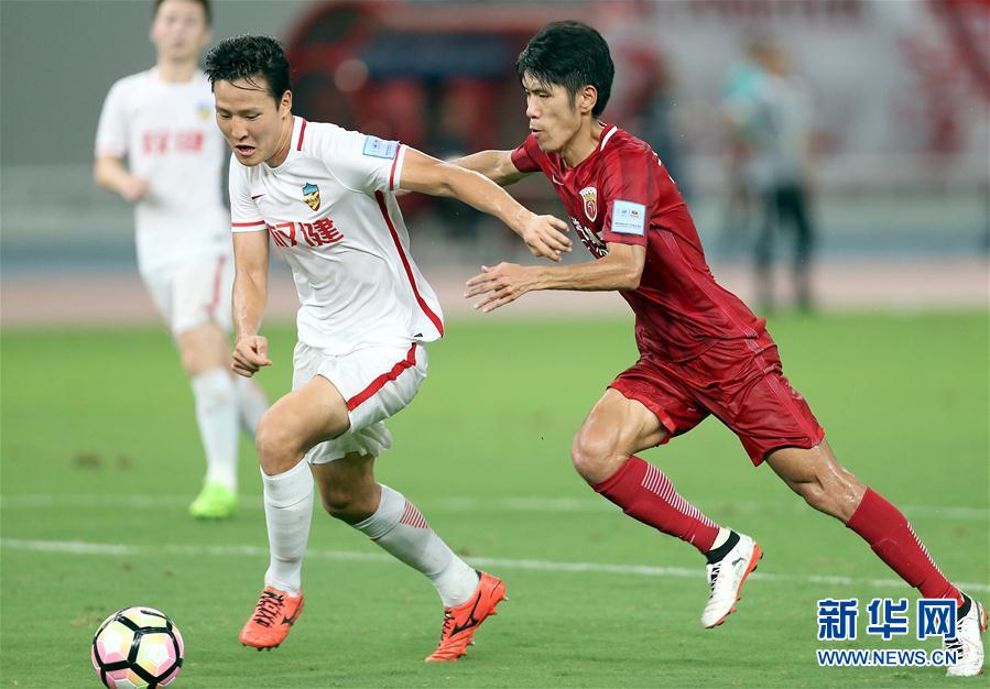 8月3日,上海上港队球员吕文君(右)与天津权健队球员权敬源在比赛中拼抢。新华社记者凡军摄