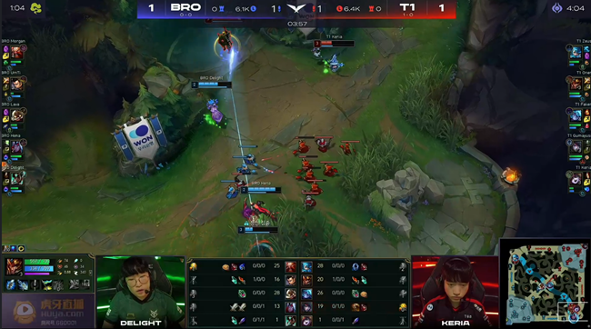 BRO中期围绕加里奥的抓边攻势非常凶猛,T1谨慎防守也难免露出一些破绽,杰斯连续阵亡两次,小龙也被BRO拿了两条,但T1依旧保持着经济上的领先。24分钟第三条小龙刷新,BRO在先手占据地形打龙的情况下尝试找机会开团,T1凭借流畅的拉扯与配合将BRO逐个击破,最终打出2换5团灭了BRO。然而好景不长,在T1接下来入侵上半野区的行动中,BRO抓到机会集火带走瑞兹,一路追杀带走T1四人,大龙落入了BRO手中!