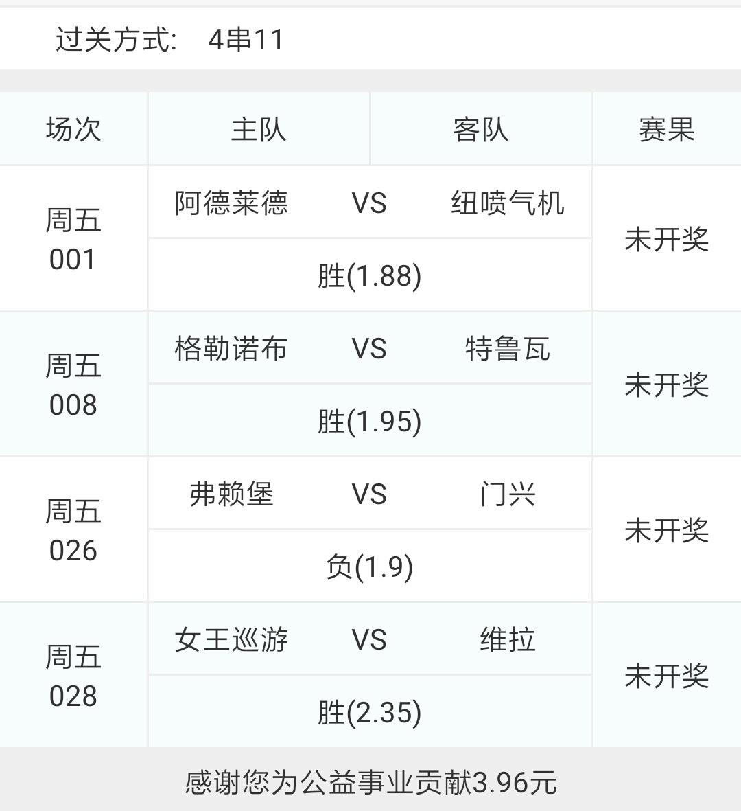 另外今天的单关德甲026弗莱堡VS 门兴,亚盘开出了主受让平半高水并逐渐走低,很可能是双方以往交手的历史让大家认为本场比赛主不败可博,但这恰好掩护了客队顺利胜出。根据双方最近的比赛状态,门兴客胜概率最大。这样就以001主胜、026客胜、028主胜、008主胜组了一个4串11,大家谨慎借鉴!