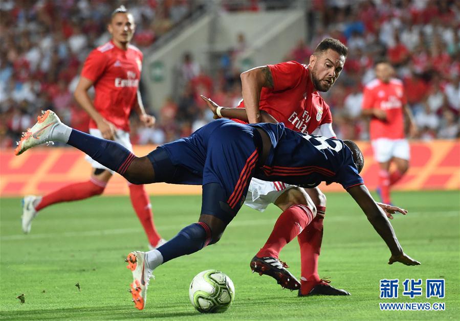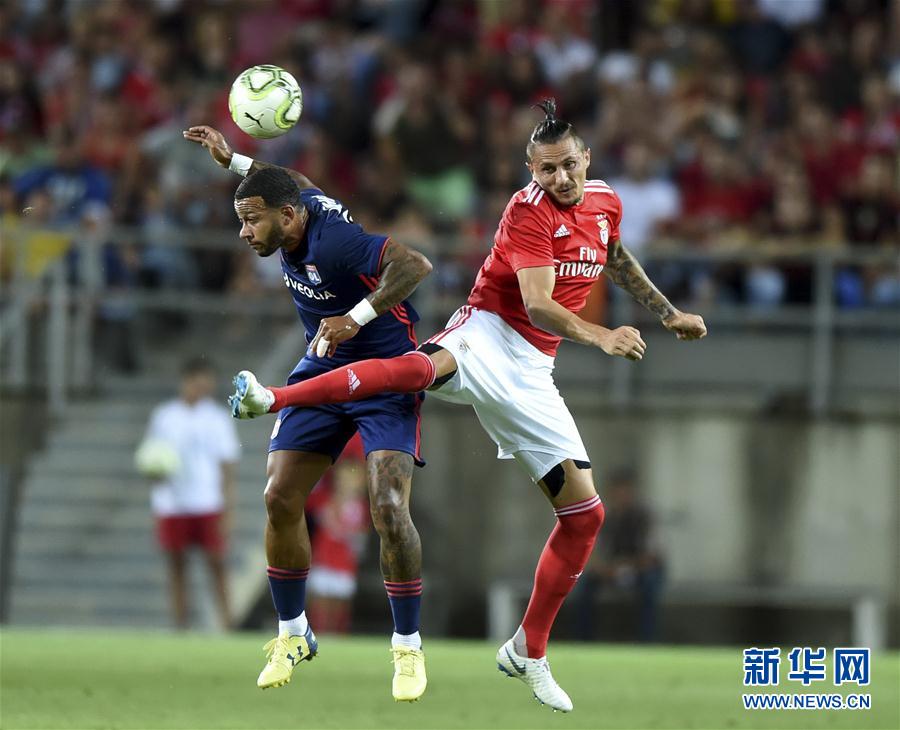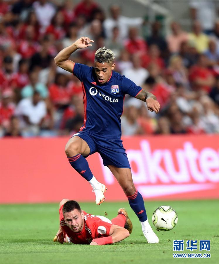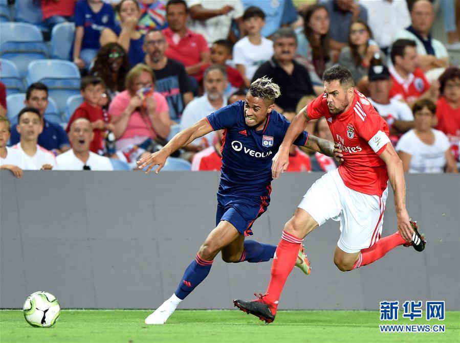↑8月1日,本菲卡队球员维埃拉(右)与里昂队球员迪亚斯在比赛中拼抢。 新华社记者张立云摄