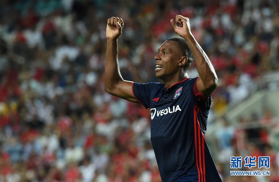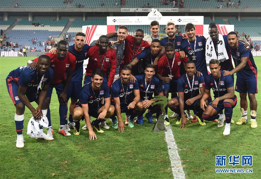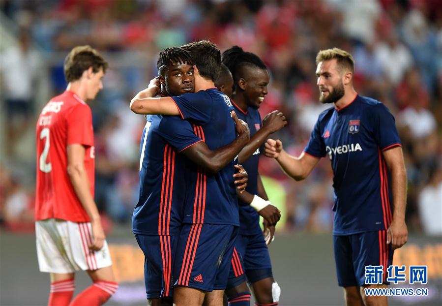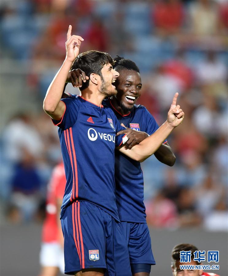 ↑8月1日,里昂队球员庆祝进球。 新华社记者张立云摄