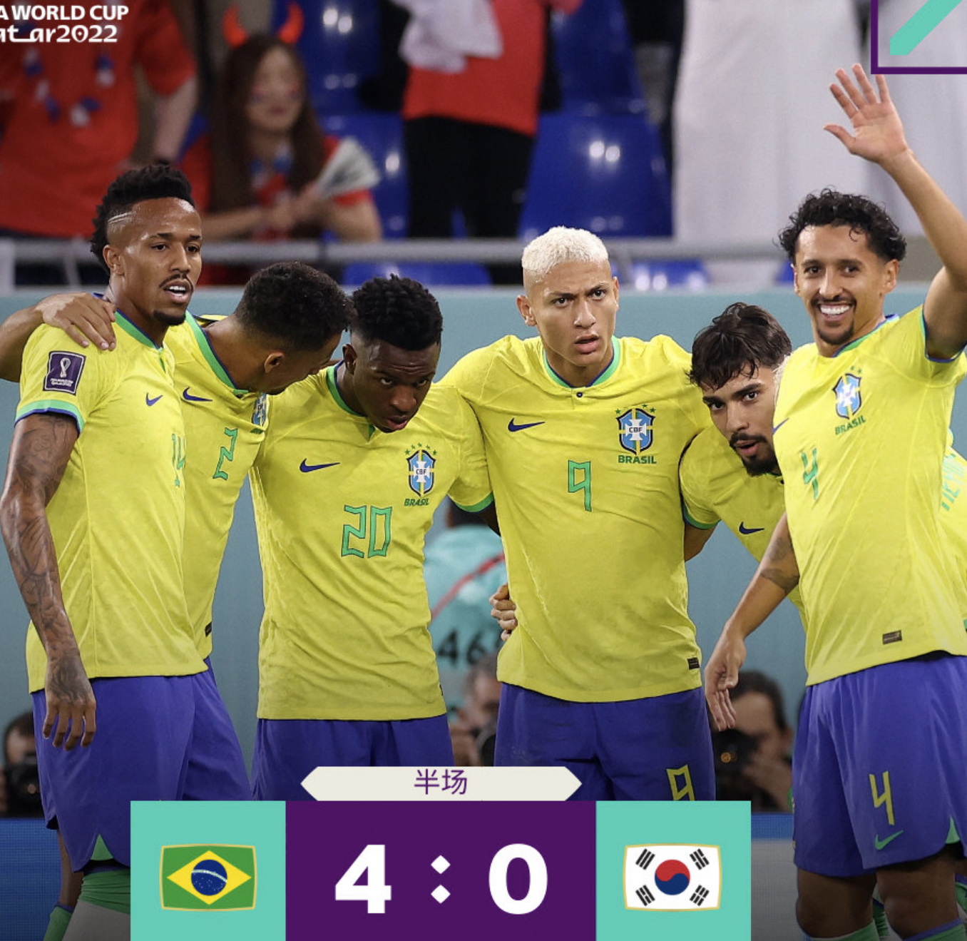 北京时间12月6日凌晨3点,2022卡塔尔世界杯一场1/8决赛在974球场进行,巴西队对阵韩国队。上半场,维尼修斯传射建功,内马尔点球破门,里沙利松和帕克塔各入一球;下半场,韩国队利用任意球机会由白昇浩扳回一城。最终,巴西队4-1淘汰韩国队,晋级八强,他们在1/4决赛将对阵克罗地亚队。