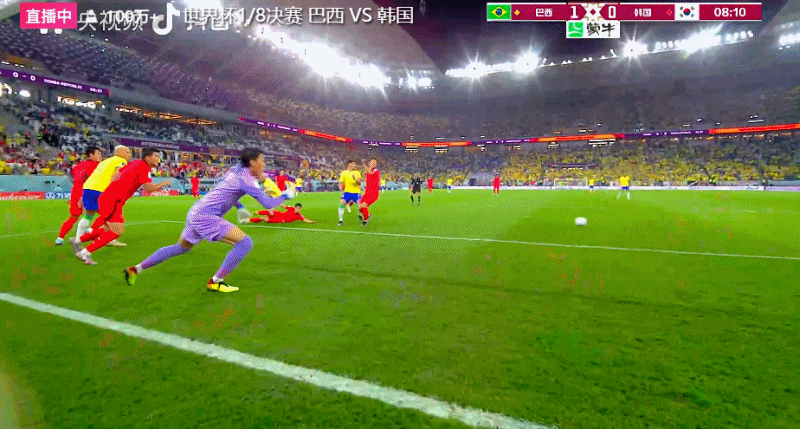 第7分钟,巴西队取得梦幻开局,拉菲尼亚在前场右路突破过人后低平球传中,禁区中路的内马尔推射没打上,后点无人防守的维尼修斯从容停球后右脚抽射破门,巴西队1-0领先韩国队。