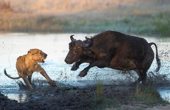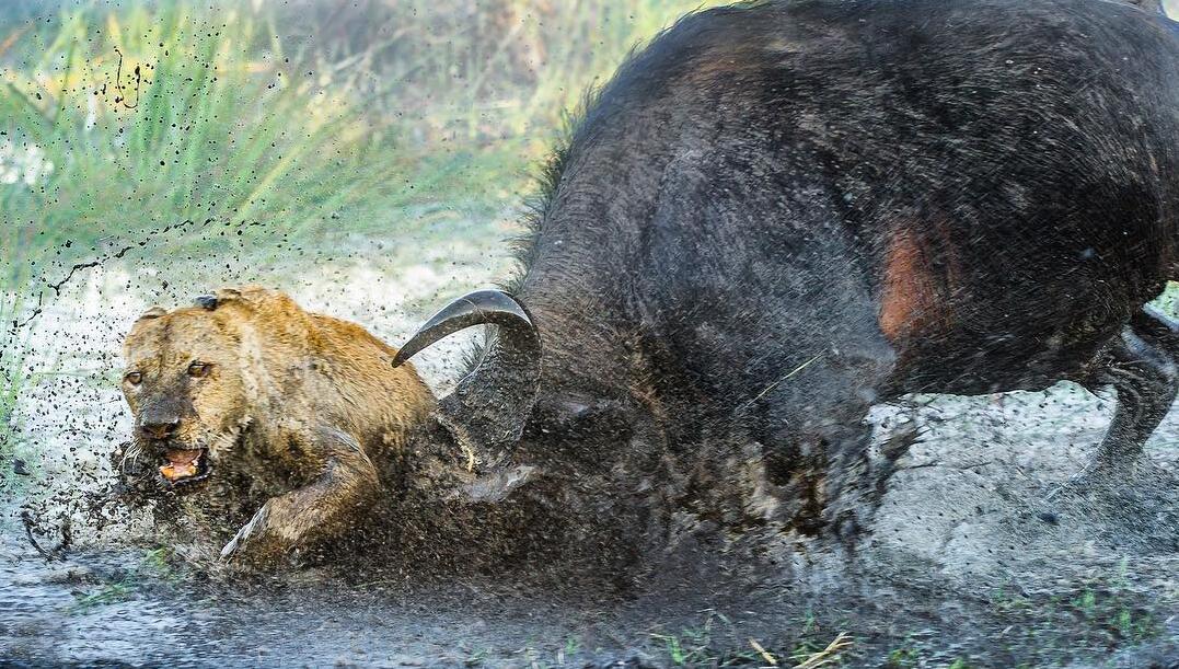 然而,年幼的它想要摆脱母狮的追杀似乎是绝无可能的,就在这时,一道庞大身影骤然横在小牛与母狮的中间——那是小牛的母亲,察觉小牛的危机,它毫不犹豫地跳了出来,于是局面瞬间就逆转了,老母狮由追逐小牛的猎手反过来变成了被母牛攻击的目标,如此近距离下母狮根本无从躲避,半秒之内母牛的牛角就狠狠地撞上了母狮的下巴。