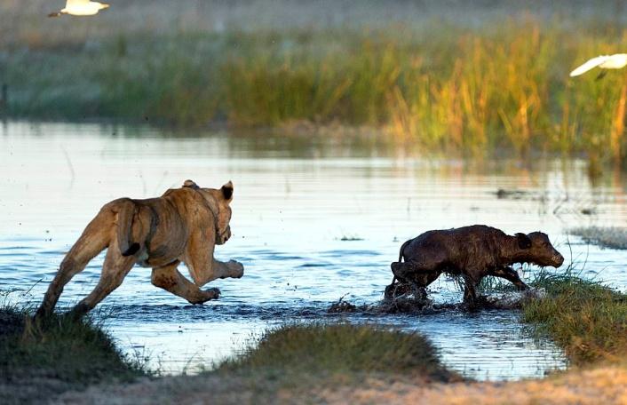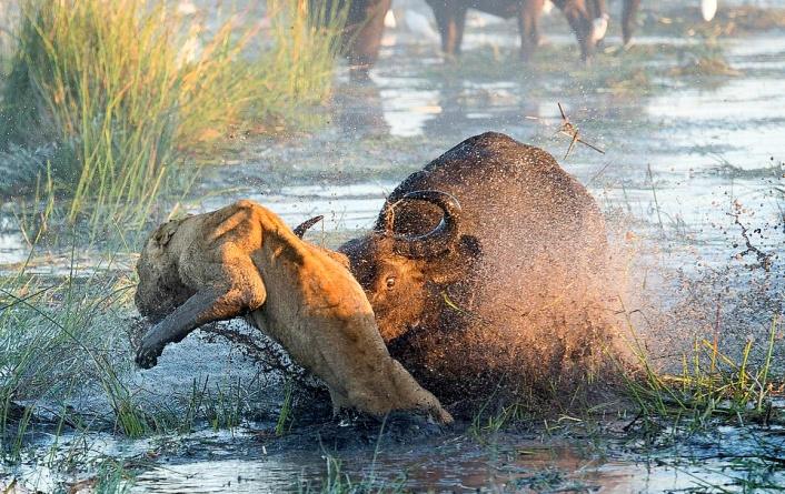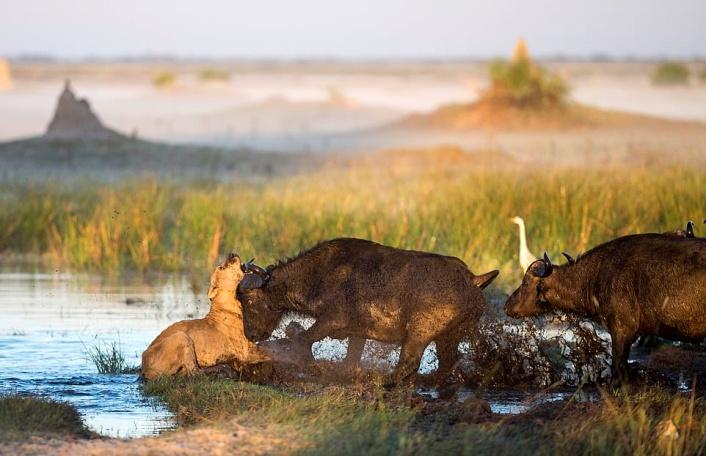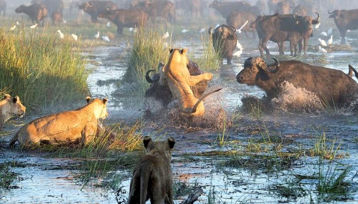 水草丰美的奥卡万戈三角洲成为旱季食草动物们的首选迁徙地,那么食肉动物也自然而然地跟着它们的猎物来到此地。在非洲的不少地方,野牛都堪称狮子的重要食物,博茨瓦纳也不例外,位于三角洲东北方向的乔贝国家公园,学者曾经做过统计,发现狮子的猎物中有46.7%是野牛,其中以小牛和亚成年野牛为主(76.8%),另外23.2%是超过2岁的成年野牛,看来,年纪尚幼的野牛更容易成为狮子的牺牲品。今天,我们要讲的狮子与野牛的冲突,也是由狮群试图捕食一只小牛引起的,这一事件中猎手和猎物双方的反应和互动,以及事件的最终结局,都比较少见,值得挑出来说一说。