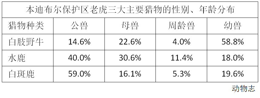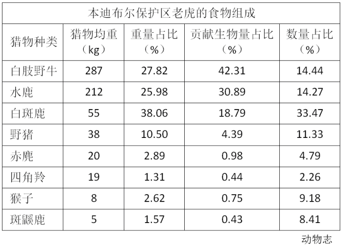 我们还要考虑,野牛要比老虎的其他主要猎物白斑鹿、水鹿大,如果按重量百分比计,野牛的占比还要大一些。如果再考虑到以大动物为食时每次捕猎的能量消耗相对小、可食用的肉量相对多,野牛为老虎贡献的生物量占比甚至更高。如在本迪布尔,野牛在老虎食谱中所占的比例,以猎物个数计是14.4%,以猎物重量计是27.8%,以猎物为老虎贡献的生物量计则高达42.3%!可以说,在本迪布尔和纳加尔霍雷,白肢野牛是老虎的主食之一。