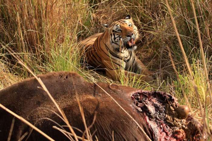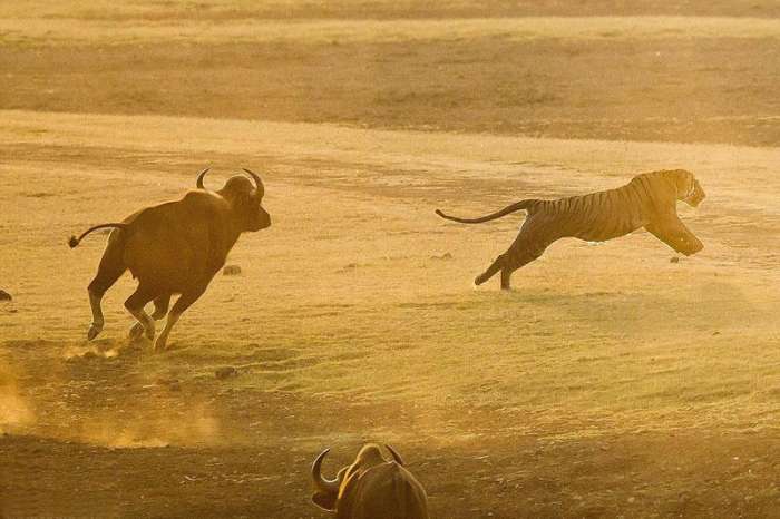 虽然老虎捕的野牛是以小牛为主,但老虎也有能力杀死成年野牛甚至大个体公牛。2009年5月,在堪哈国家公园的草地上,有一只壮年雄虎杀死了一只重600-700千克的大公牛。老虎跳上去咬牛的后背,并用锋利的后爪切断了牛的后腿肌腱,这使得这个庞然大物轰然倒地。之后,老虎等不到牛咽气就开始吃牛的后腿和屁股。可怜的野牛惨叫了两个小时才死去!这件事告诉我们,老虎是有能力捕杀成年公牛的。老虎杀死的最大野牛据说有一吨重!