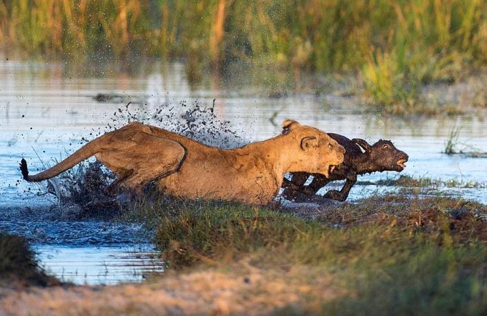 当一群野牛悠然自得地享用水草时,由数只母狮组成的攻击群已经把目光瞄向了它们,狮群的首领是一只18岁的母狮,这个年纪对于狮子来说已是风烛残年,不过,这只母狮并不服老,像是为了证明自己廉颇未老,它决定打头阵率先冲向处在牛群边缘的一只小牛。湿地不比草原那般容易实施突袭,尽管母狮已经足够小心,但原本毫无防备的小牛还是在最后一刻反应过来,求生本能促使它拼了命地逃跑。