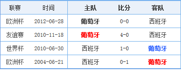 葡萄牙队与西班牙队自2002年至今共有6次交锋,战绩为2胜2平2负,实力不分伯仲;其中正式比赛交手三次,葡萄牙1胜1平1负,两队都占不了优势。不过在2010年世界杯16强战,葡萄牙队曾0比1负于西班牙队,最终“斗牛士军团”顺利夺冠。