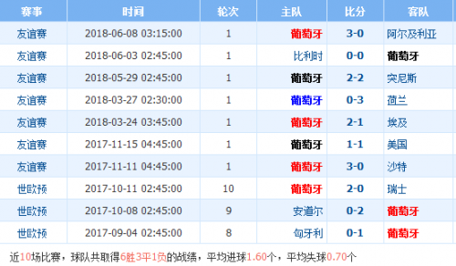 葡萄牙近期比赛战绩