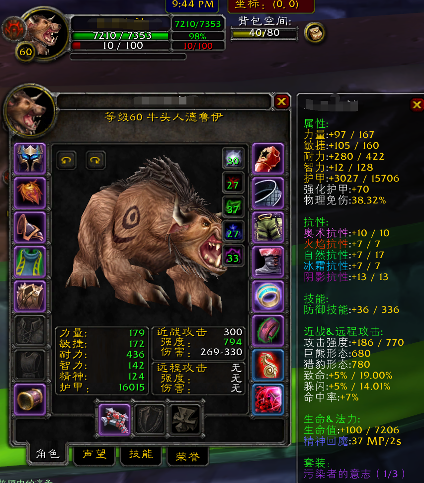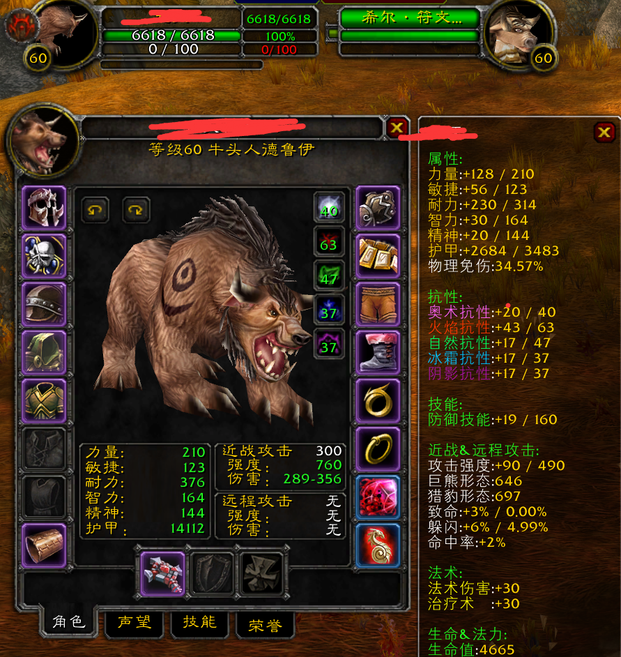 熊的插件显示免伤是人形态的,实际这会儿的护甲免伤是72%不到,如果计算25%的灵感和先祖加成,这个时候熊的护甲免伤还是跟战士有的拼的,T3毕业的战士和熊的对比如下(无buff,有附魔)。