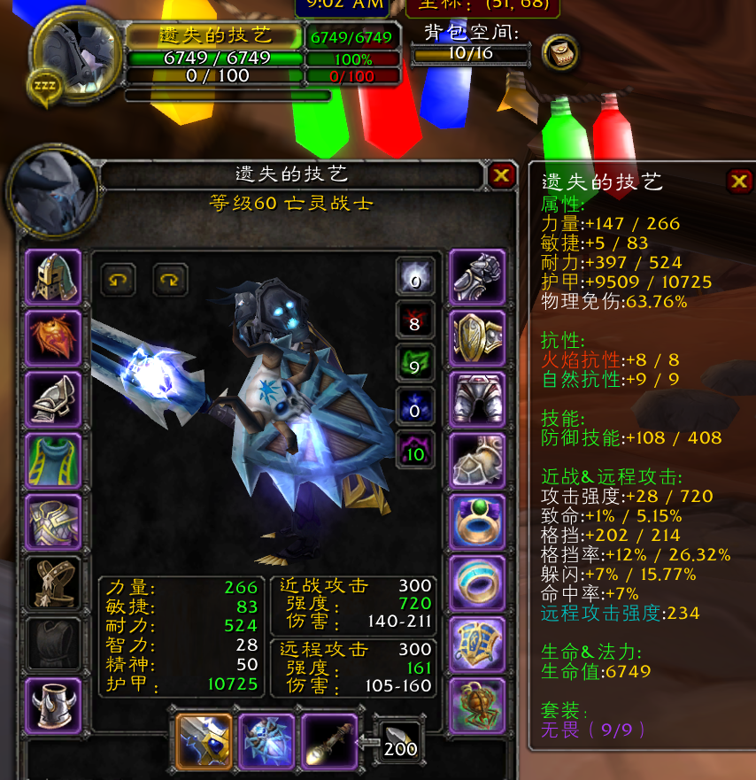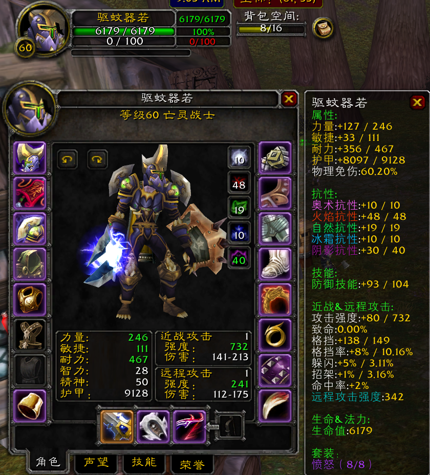 以下是BWL毕业战士对比BWL毕业熊坦,配装没错的情况下(无buff,无附魔)(凑不要脸的加了三件督军套,实际应该是蓝色品质,不过护甲没太大变化)。