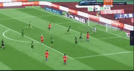 第37分钟,山东鲁能再次进球,蒿俊闵前场断球成功,佩莱背身做球,格德斯不停球直接送出直塞球撕开北京国安后防线,蒿俊闵形成单刀后选择无私横传,金敬道铲入空门,山东鲁能2-0领先。