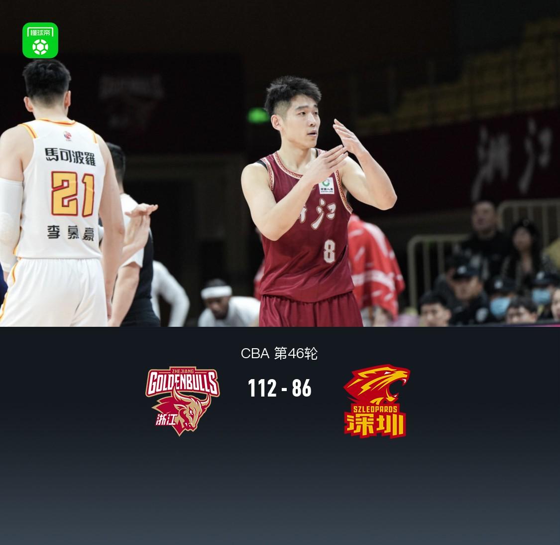北京时间3月21日CBA 第46轮,浙江稠州金租对阵深圳马可波罗。半场浙江55-45深圳,最终浙江112-86深圳。