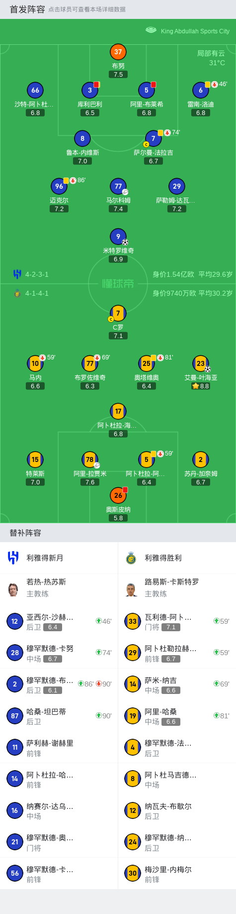 北京时间6月1日沙特国王杯决赛,利雅得新月主场对阵利雅得胜利。上半场,米特罗维奇破门。下半场,奥斯皮纳禁区外手球犯规被罚下。布莱希头顶胜利球员也被罚下。叶海亚最后时刻头槌扳平比分,库利巴利踢到门将也被罚下。90分钟战罢,胜利1-1新月,双方进入加时赛。