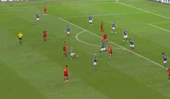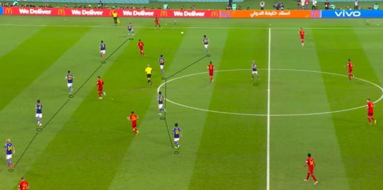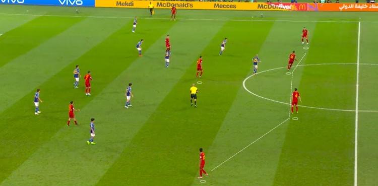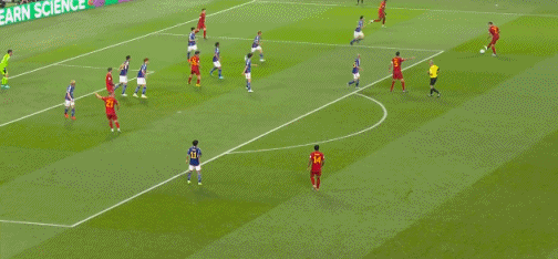 从上图中可以看到,在完全掌握比赛控制权的基础上,西班牙队全线压上,甚至整条后防线都越过中场线,这就是上半场的一个整体“面貌”——日本队全员回收到本方半场防守,西班牙队全员进攻到对方半场。