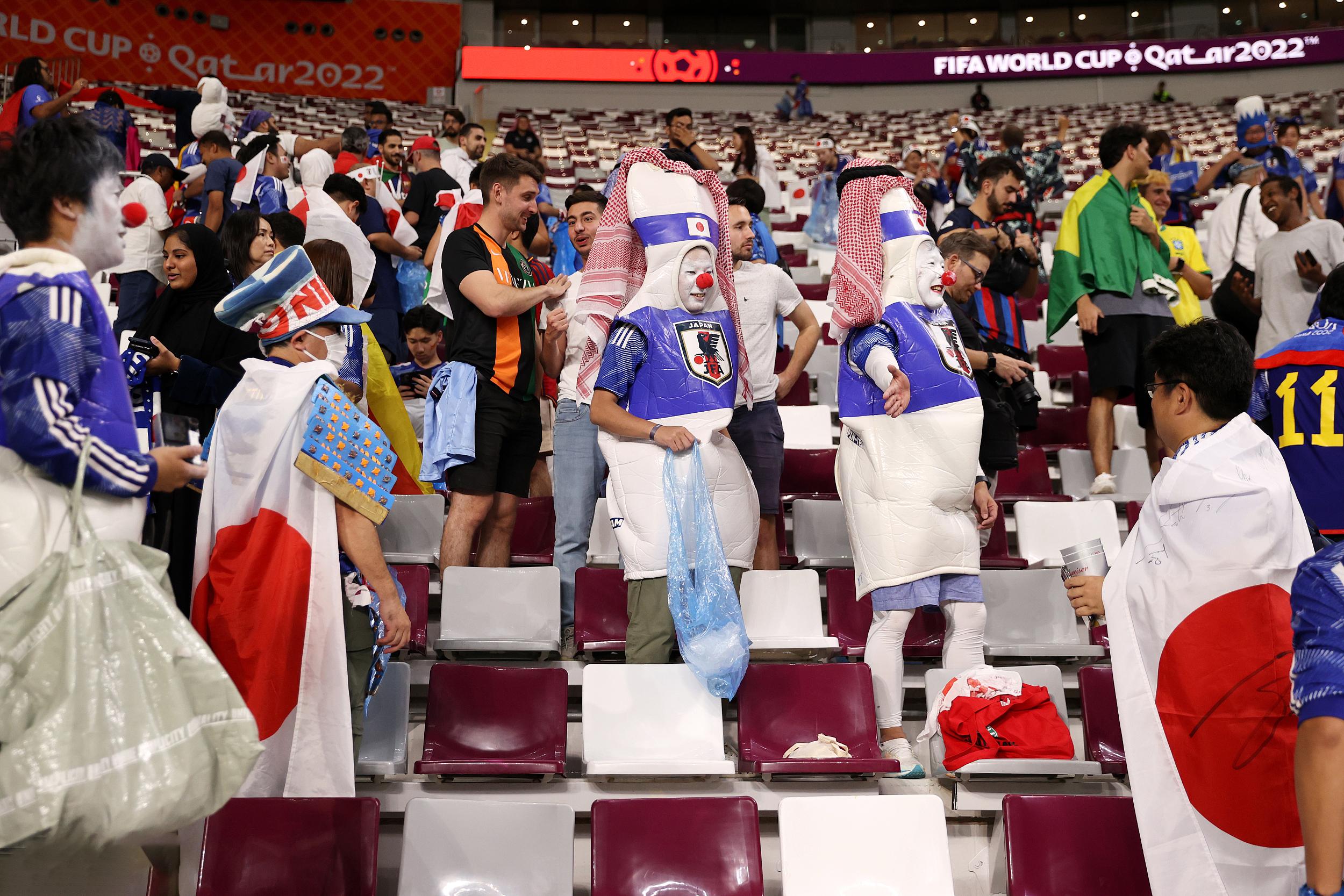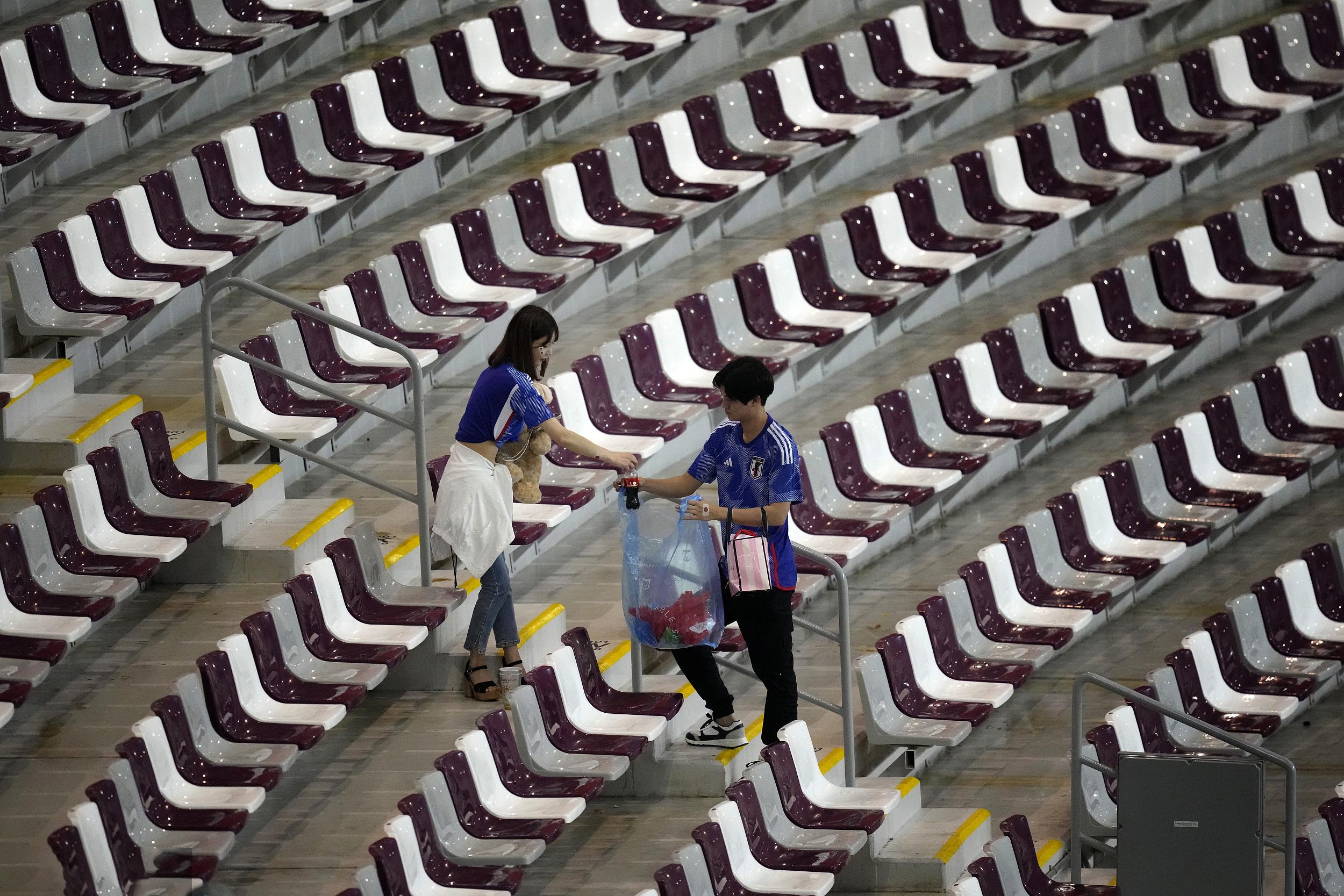 目睹球队小组出线后,日本球迷延续传统打扫看台