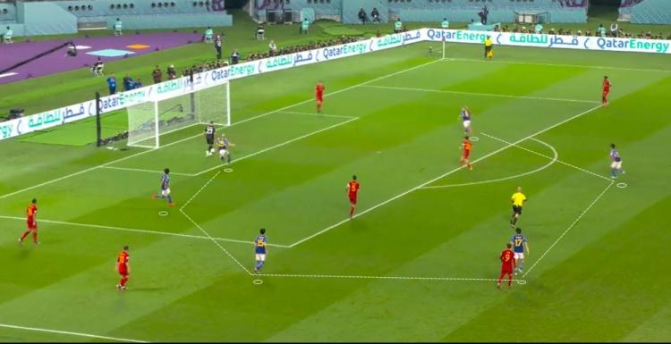 西班牙队的进球正是右路打开缺口后,加维下底送出传中被守田英正解围,跟上的阿斯皮利奎塔送出精准传中,直接找到了埋伏在板仓滉身后的莫拉塔,后者头球攻门帮助球队打破僵局。日本队在快速的转换下防守重心都靠向了前点,忽视了后点的莫拉塔,而阿斯皮利奎塔的传中球也展现了精湛的脚下技术,让莫拉塔非常舒服地完成破门。