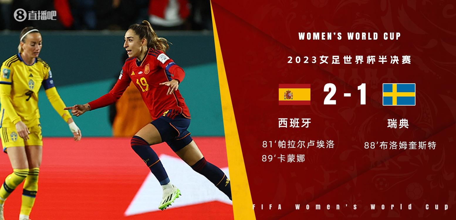 直播吧8月15日讯 北京时间8月15日16:00,女足世界杯半决赛西班牙迎战瑞典的比赛,上半场卡蒙娜远射造险,双方互有攻守,半场结束,西班牙女足0-0瑞典女足。下半场雷东多门前失良机,帕拉尔卢埃洛替补出场建功,布洛姆奎斯特扳平,卡蒙娜世界波绝杀,最终西班牙女足2-1瑞典女足首进决赛。