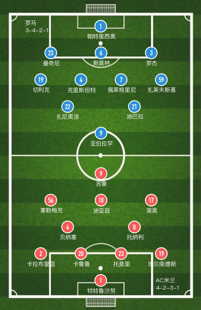 罗马(3-4-2-1): 1-帕特里西奥,23-曼奇尼(89' 贝洛蒂),6-斯莫林,3-罗杰,19-切利克(78' 沙拉维),4-克里斯坦特(66' 马蒂奇),7-佩莱格里尼,59-扎莱夫斯基,22-扎尼奥洛(66' 塔伊洛维奇),21-迪巴拉,9-亚伯拉罕