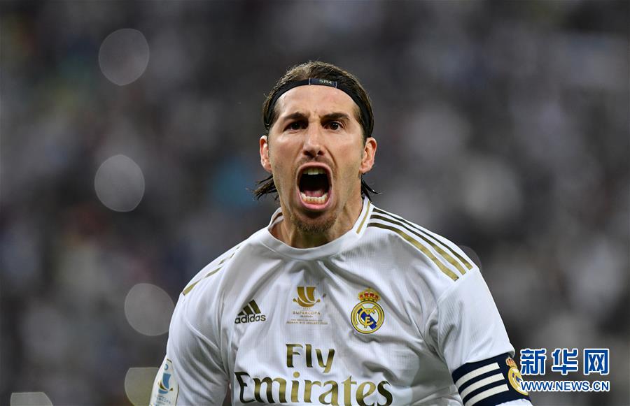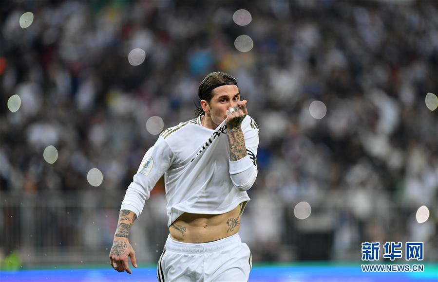 1月12日,皇家马德里队球员拉莫斯在点球大战中打入制胜一球后庆祝。当日,在沙特阿拉伯吉达举行的西班牙超级杯决赛中,皇家马德里队与马德里竞技队在120分钟内战成0比0平,最终皇家马德里队在点球大战中以4比1获胜,夺得冠军。新华社/路透