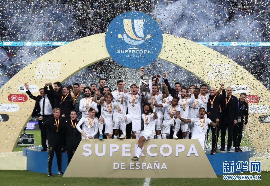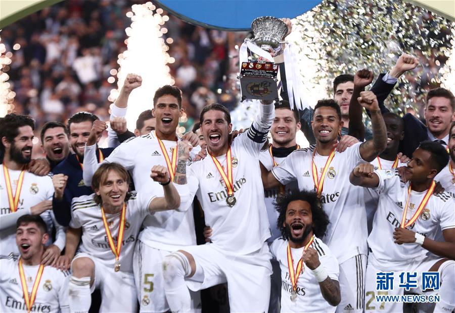 1月12日,皇家马德里队成员在颁奖仪式上庆祝。当日,在沙特阿拉伯吉达举行的西班牙超级杯决赛中,皇家马德里队与马德里竞技队在120分钟内战成0比0平,最终皇家马德里队在点球大战中以4比1获胜,夺得冠军。新华社/路透
