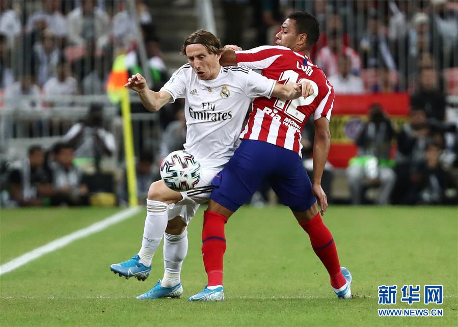 1月12日,皇家马德里队球员莫德里奇(左)和马德里竞技队球员洛迪拼抢。当日,在沙特阿拉伯吉达举行的西班牙超级杯决赛中,皇家马德里队与马德里竞技队在120分钟内战成0比0平,最终皇家马德里队在点球大战中以4比1获胜,夺得冠军。新华社/路透