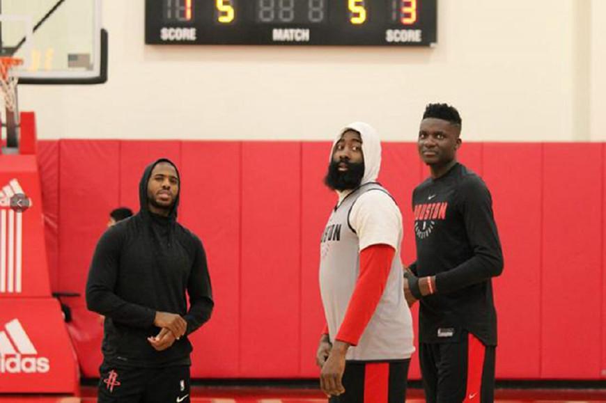 而据随后官方发布的图集,本场比赛,火箭队竟然是全主力出战,哈登、保罗、戈登、塔克、周琦都有上场,塔克也衣衫全湿,看得出来双方球队进行了非常不错的交流。