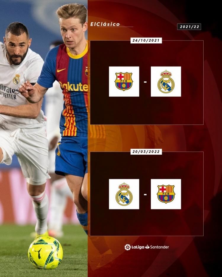 直播吧6月30日讯 新赛季西甲国家德比时间确定!首回合2021年10月24日,次回合2022年3月20日。