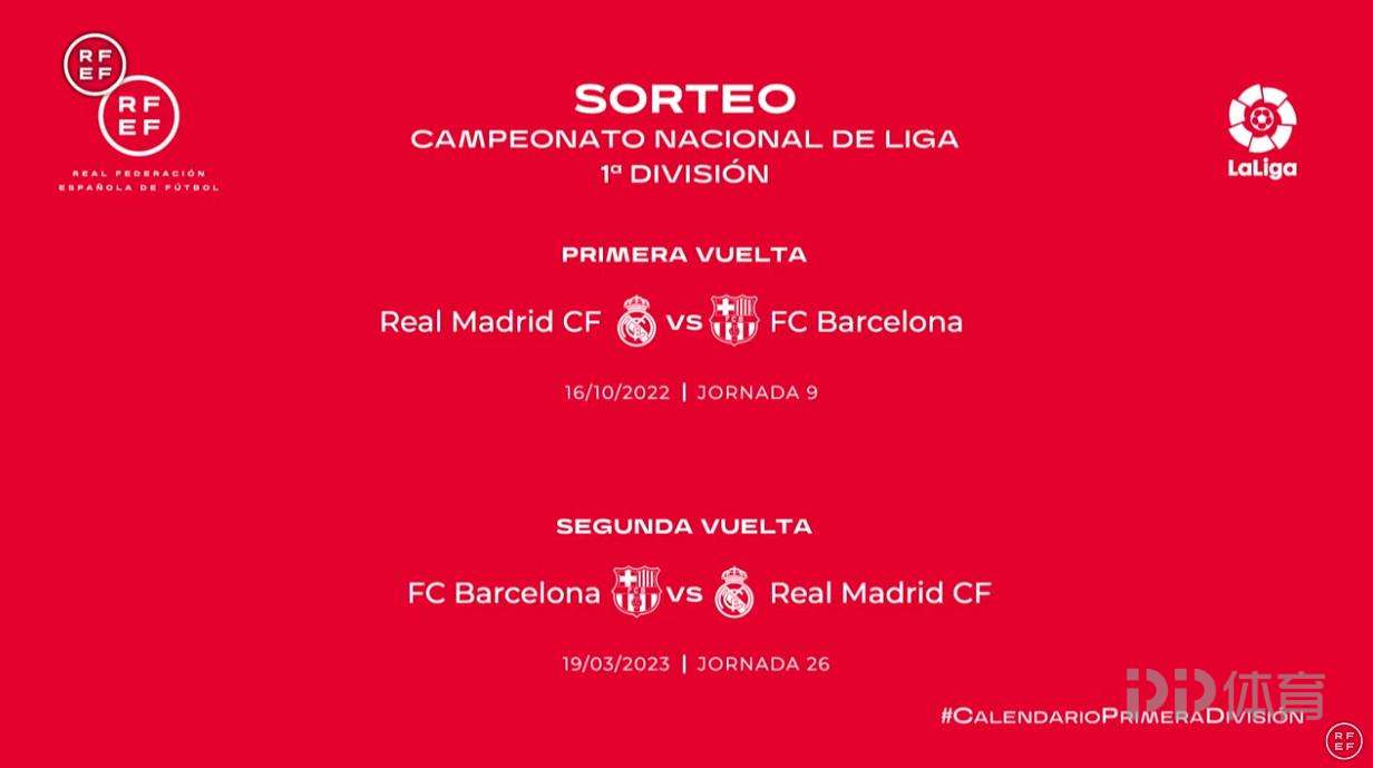 首回合国家德比将在10月16日打响,皇马主场对阵巴萨;次回合为2023年3月19日,巴萨主场对阵皇马。