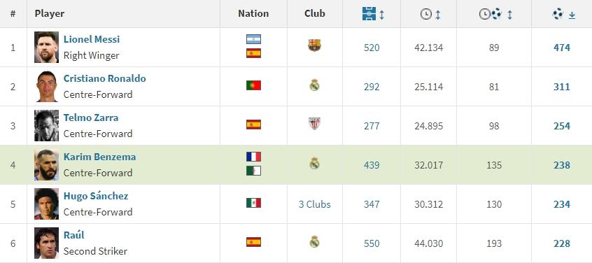 据统计,本泽马的西甲总进球数可以排在历史第4位,仅次于梅西、C罗和萨拉(毕尔巴鄂竞技传奇前锋,西甲本土金靴奖正是以他的名字命名)。