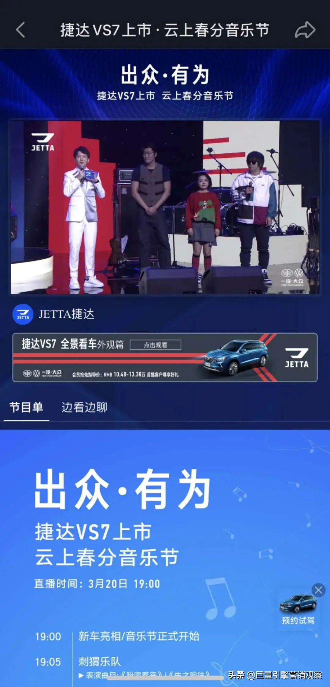 新车上市直播如何解决同质化问题,增加互动实现直播破圈,引发长效关注?近日,捷达联手巨量引擎首创云端新车上市新玩法,2月26日启动“尝鲜上市大咖云种草”直播活动为捷达VS7上市全方位造势,吸引公众眼球,3月20日再以“出众·有为 云上春分音乐节”的创新形式正式拉开上市大幕。