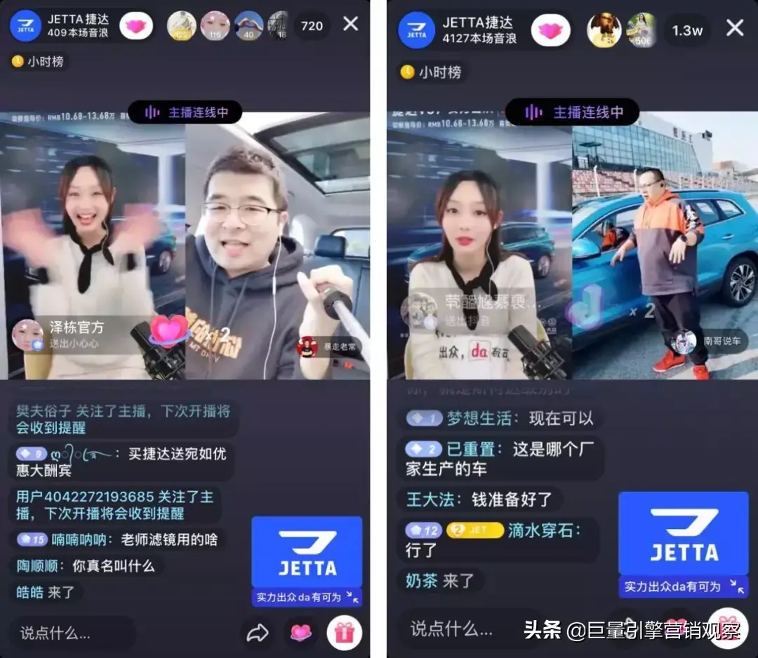 捷达VS7邀请玩车女神、车老湿、小西西等头部达人以“1+6”组队形式线上“连麦互动”,通过“云试驾、云实验、云课堂”三大模式向观众传递驾驶知识、汽车性能测试、购车常识等优质内容,借助不同风格的达人全方位去展现车的卖点,并创新连麦的方式实现全网粉丝传播裂变,将圈层影响力放至最大。此次连麦互动直播总在线观看人数超过92万、收获音浪总数近10万,有长达1个小时中同时在线人数保持在2.4万+。