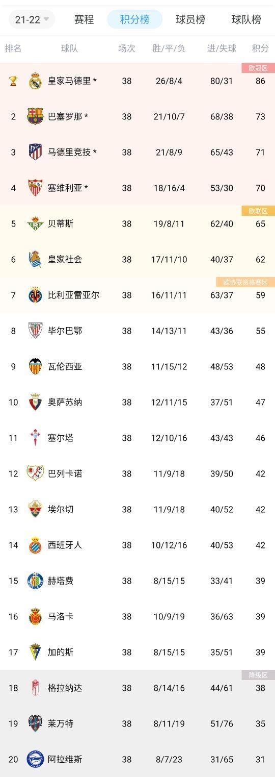 皇马86分夺冠,巴萨73分获亚军,马竞71分第三,塞维70分第四,这4队将参加下赛季欧冠。