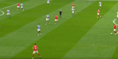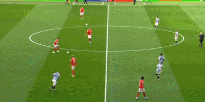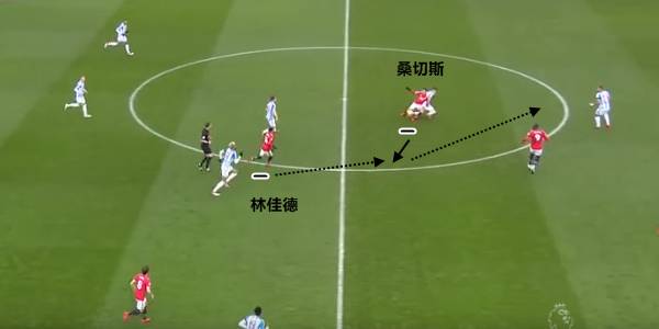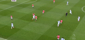 下半场比赛里,桑切斯的位置出现了调整。他开始回撤到更深地位置发动进攻,通过他的个人能力带动哈德斯菲尔德的防守站位。这次的突破,一下子吸引了客队3名球员,让马塔获得了侧翼走廊的空间。麦克托米奈的及时分球,让马塔获得了很好地传中机会。
