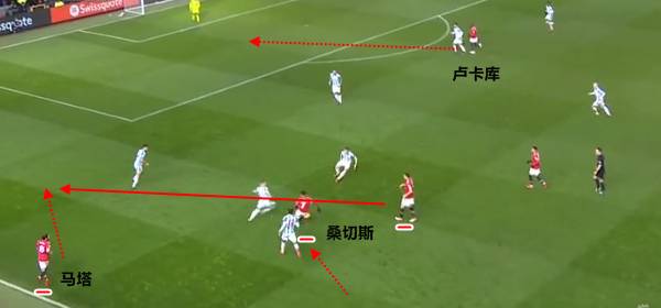 桑切斯即便在中路位置拿球,但是他也因为跟队友之间默契不足,无法有效地将整体带动起来。这次第一下的传球来自于桑切斯给到卢卡库,随后皮球转起来之后,曼联队就难以再次找到把球送回到桑切斯的脚下。最终边路强行传中落点不佳,没能形成威胁。