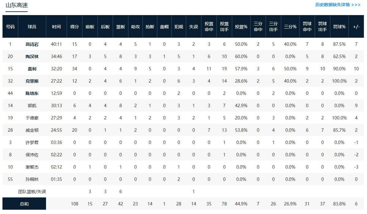 山东高速贾马尔-盖利34分4板9助5断,威金顿20分1板2助,陶汉林17分7板3助3断1帽。