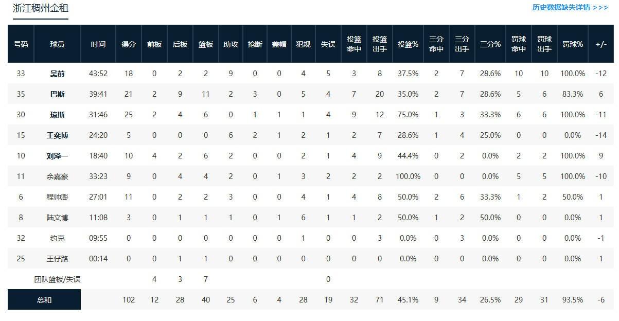 浙江稠州金租达米安-琼斯25分6板1断1帽,帕里斯-巴斯21分11板2助3断,吴前18分2板9助;